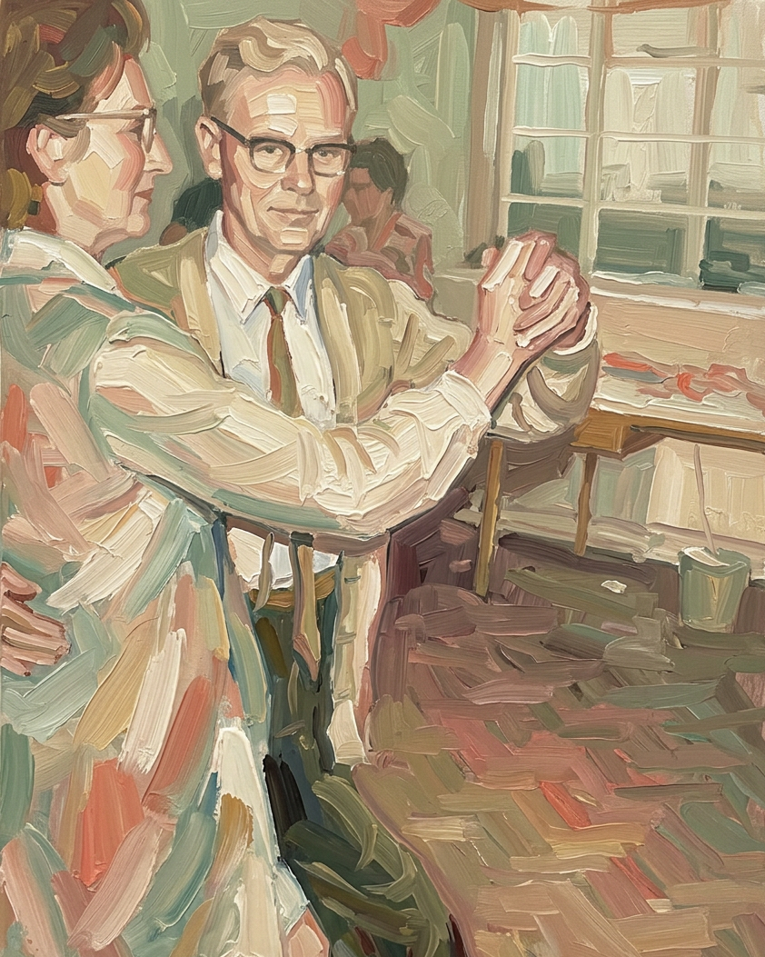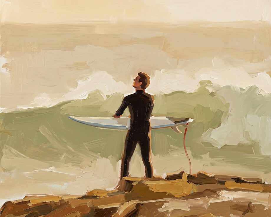 The most stylised option. Subjects are simplified into broad planes of interlocking color — faces built from a few decisive strokes, clothing and backgrounds reduced to bold color fields. Think of the Bay Area Figurative painters: David Park, Elmer Bischoff, Diebenkorn's figurative work. The composition feels graphic and intentional, with strong shapes and clear value structure.